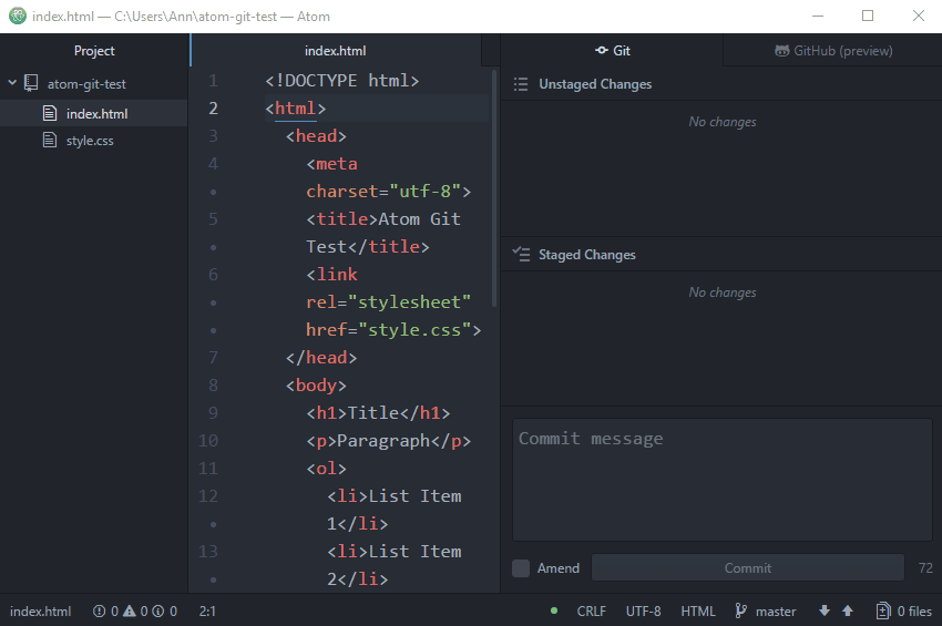The github package brings git and github integration right inside your editor! The new project will be added to the tree view. Now you can switch or create branches, stage changes, commit, pull and push, resolve merge conflicts, view and checkout pull requests and more. I quickly created two test files, index.html and style.css, to see how staging works. This package is bundled with atom starting in version 1.18, and does not need to be installed separately. The mit license grant is not for github's trademarks, which include the logo designs.. Visit the 🚀 documentation to learn how to use all the features.